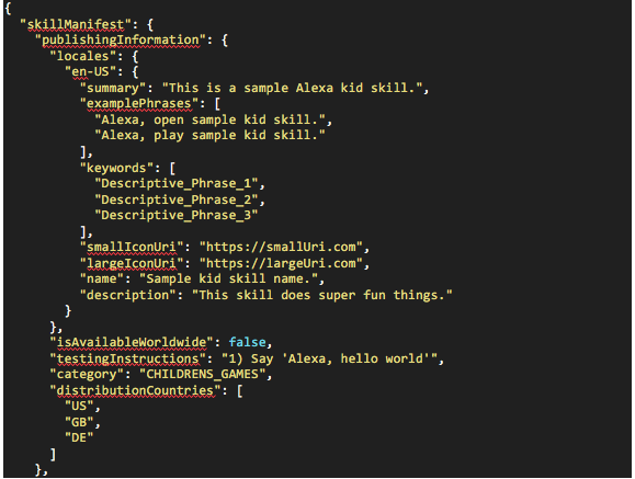 Similarly, to designate your Alexa skill as one intended for kids when using the Skill Management API, two things are required in the skill manifest (skill.json file).