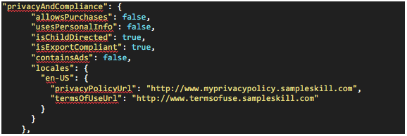 Second, skillManifest.privacyAndCompliance.isChildDirected must be set to true to permit you to distribute the child-directed skill, and enable customers to provide consent for their children to use child-directed experiences. For example: